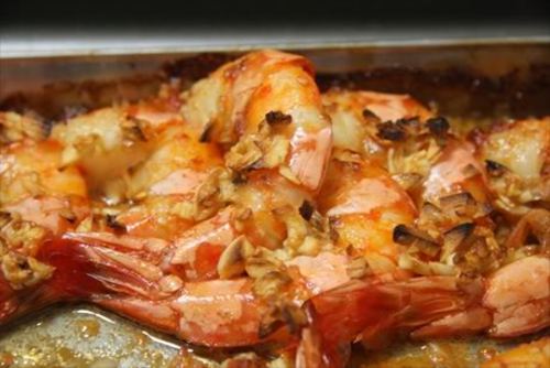 Tôm nướng tỏi : Nguyên liệu : 10 con tôm sú 100gr mỗi con, tỏi bóc vỏ băm nhỏ, gia vị, dầu. Cách chế biến : Tôm bóc vỏ để chừa vỏ ở đuôi, phần đầu cho đẹp. Ướp tôm với tỏi, gia vị cho ngấm trong khoảng 30 phút. Xếp tôm lên khay nướng, rưới dầu lên trên. Vặn lò 200 độ C, nướng 30 phút.
